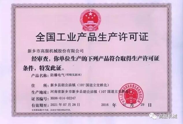 2016年3月,高服機械生產的防爆電氣通過國家質量監督檢驗檢疫總局的檢測和產品審核,順利獲得防爆電氣生產許可證!